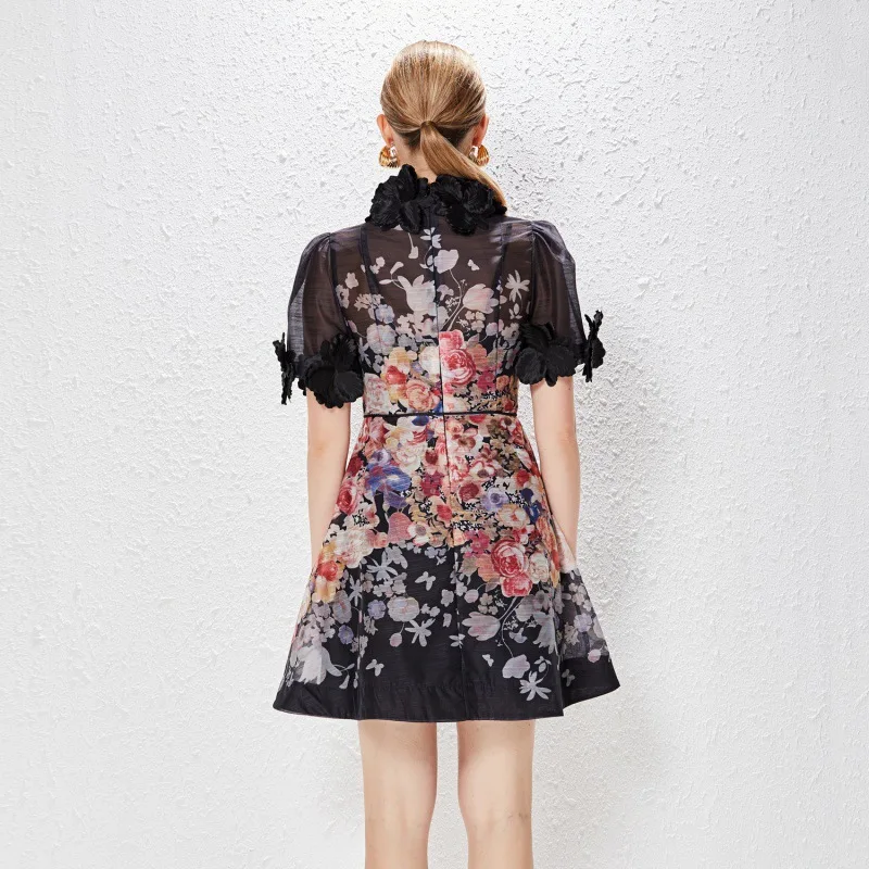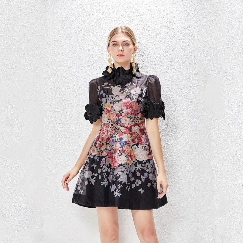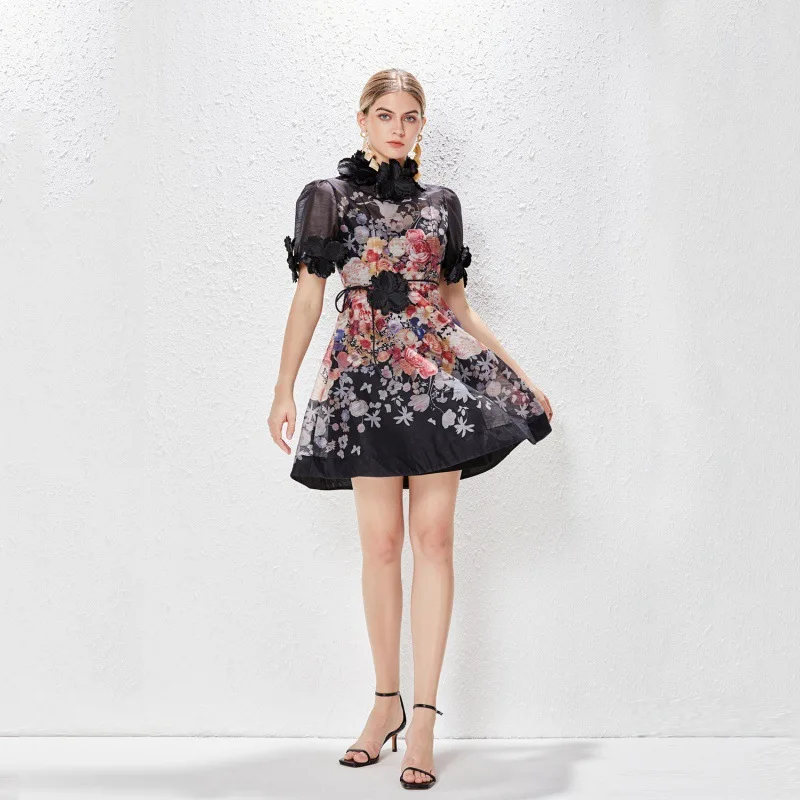 Design and Fabric Crafted from premium chiffon, this dress offers a light and breezy feel, perfect for warm weather. The fabric’s slight stretch ensures a comfortable fit, hugging your body in all the right places while allowing for easy movement. The intricate 3D flower detailing adds a touch of whimsy and femininity, making this dress a standout piece in any wardrobe.